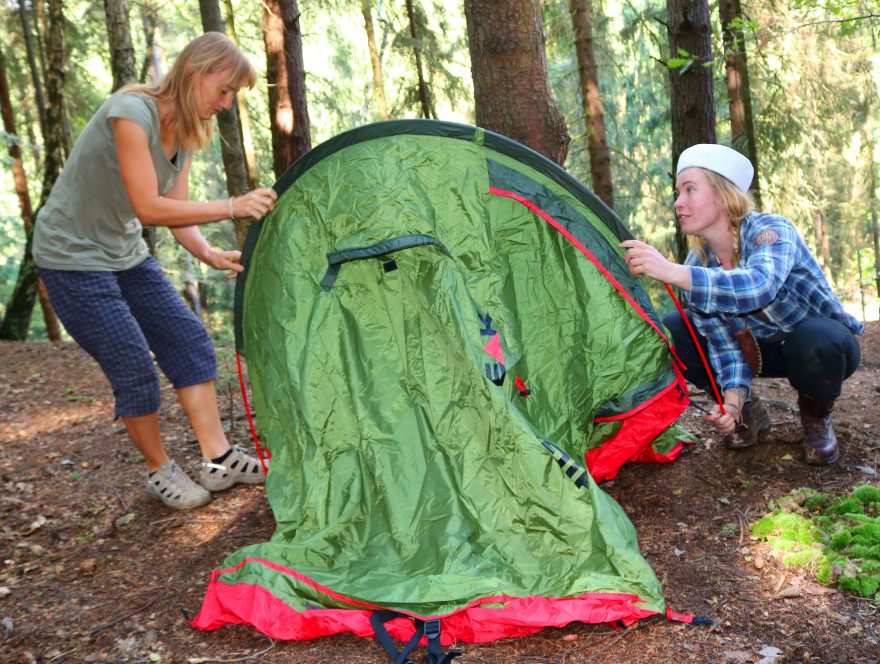 Vylézání ze stanu High Peak Siskin.