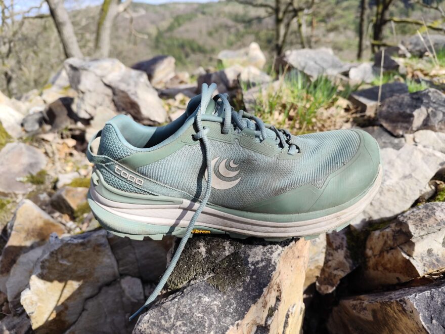 Odolný svršek a prodloužený gumový okop ochrání nohu i v kamenitých terénech – Topo Traverse