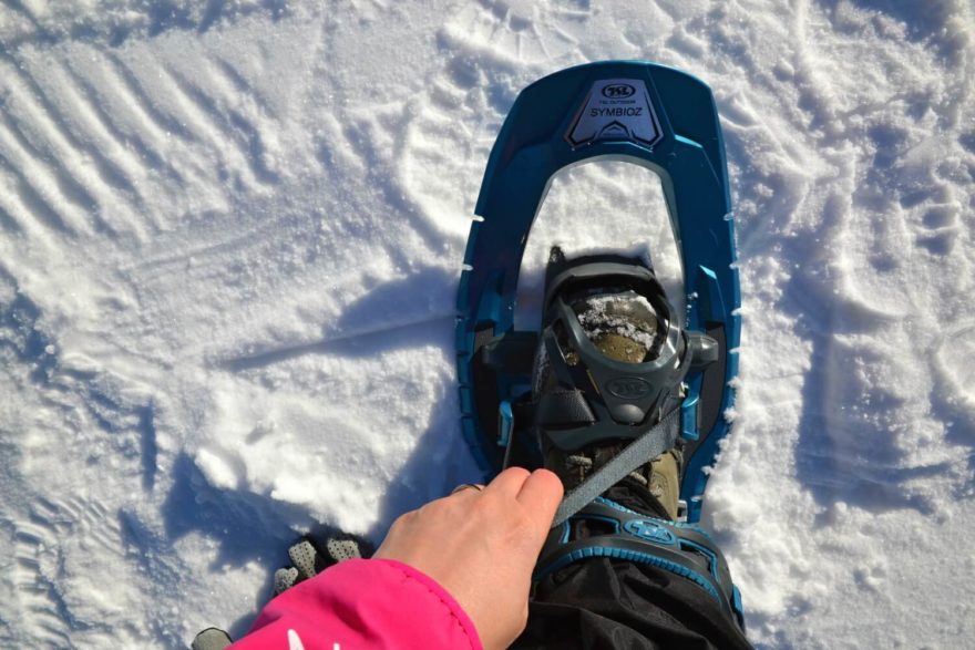 Utažený popruh na špičce je možné složit pod sponku, aby nikde neplandal. Sněžnice TSL Symbioz Hyperflex Access