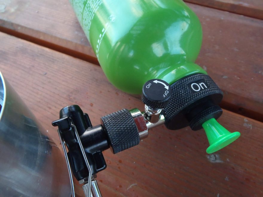 Do ruda rozpálený vařič OPTIMUS Polaris Optifuel a tlaková lahev v pozici Off.
