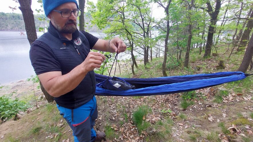 Oba konce elastických šňůr takto secvaknu do S karabinky - YATE NESTO