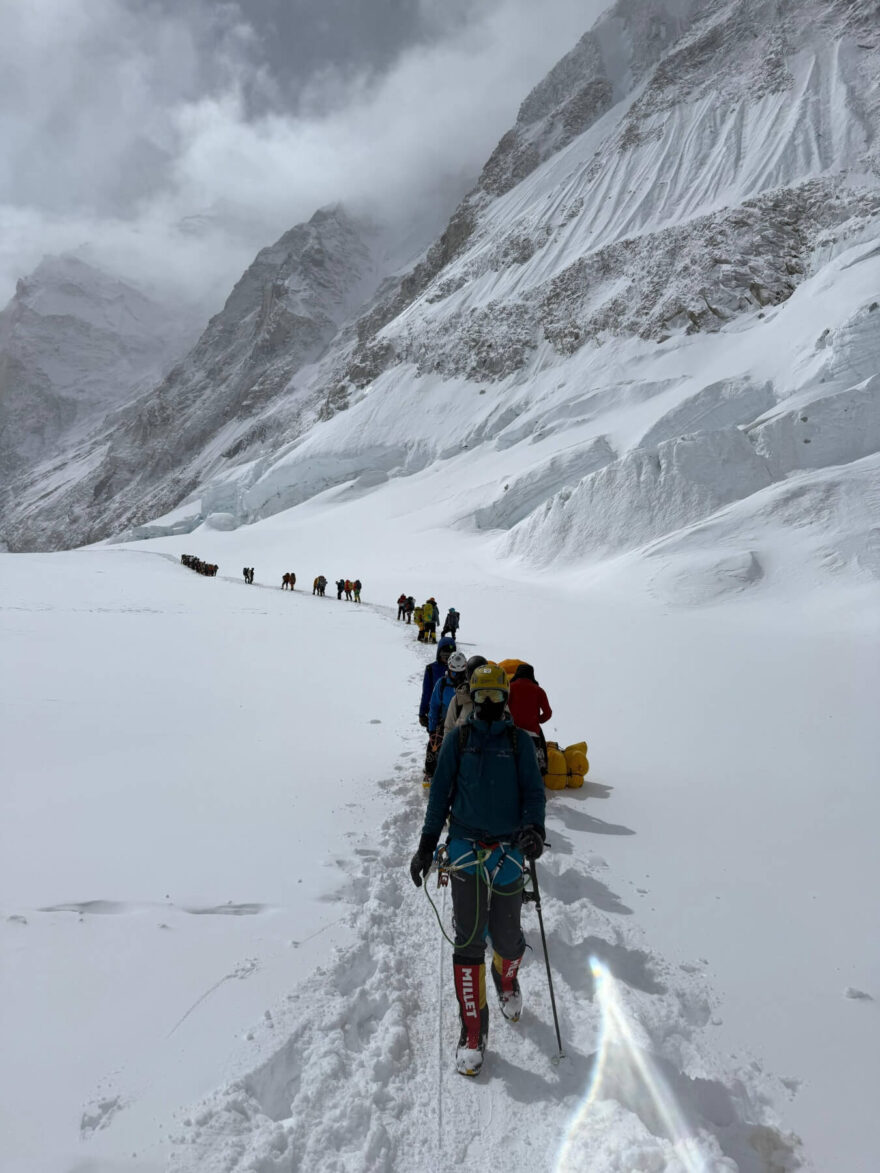 Asi desetimetrový vertikální žebřík v ledopádu Khumbu mezi EBC a C1. Everest, Himálaj, Nepál.