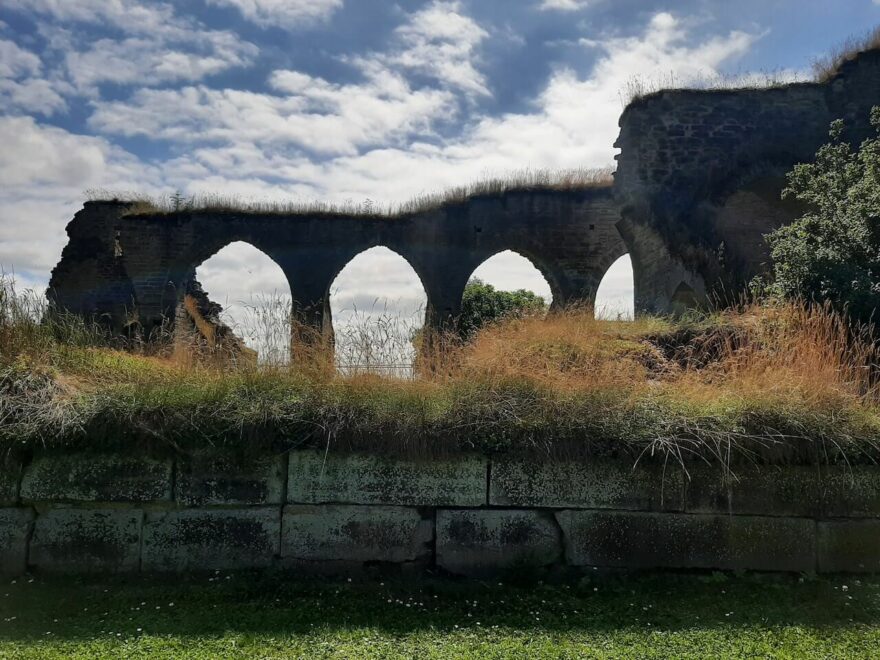 Zbytky kamenných kleneb ve volně přístupných ruinách cisterciáckého kláštera Alvastra, rezervace Omberg u jezera Vättern, Švédsko