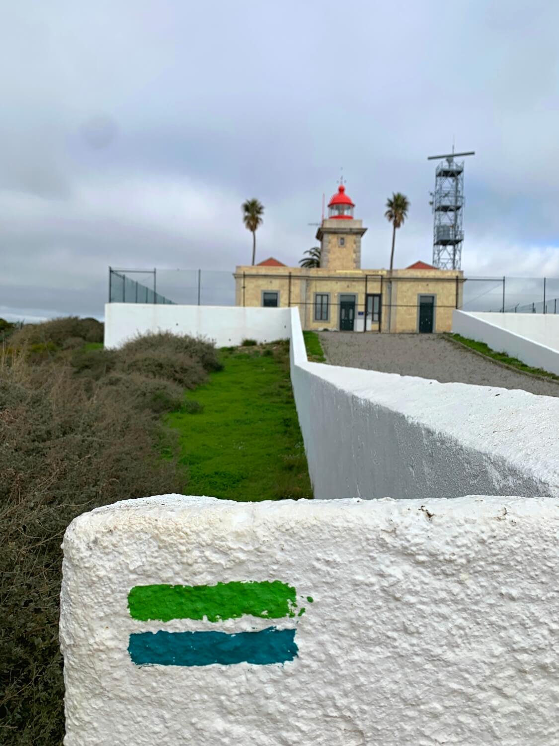 Modro-zelené značení Fisherman´s Trail, Rota Vicentina. Portugalsko.
