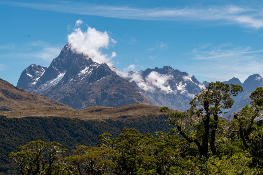 Výhledy na horské štíty Jižních Alp, Routeburn trek, Nový Zéland.