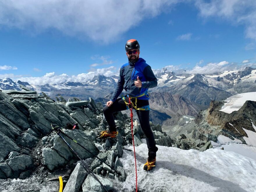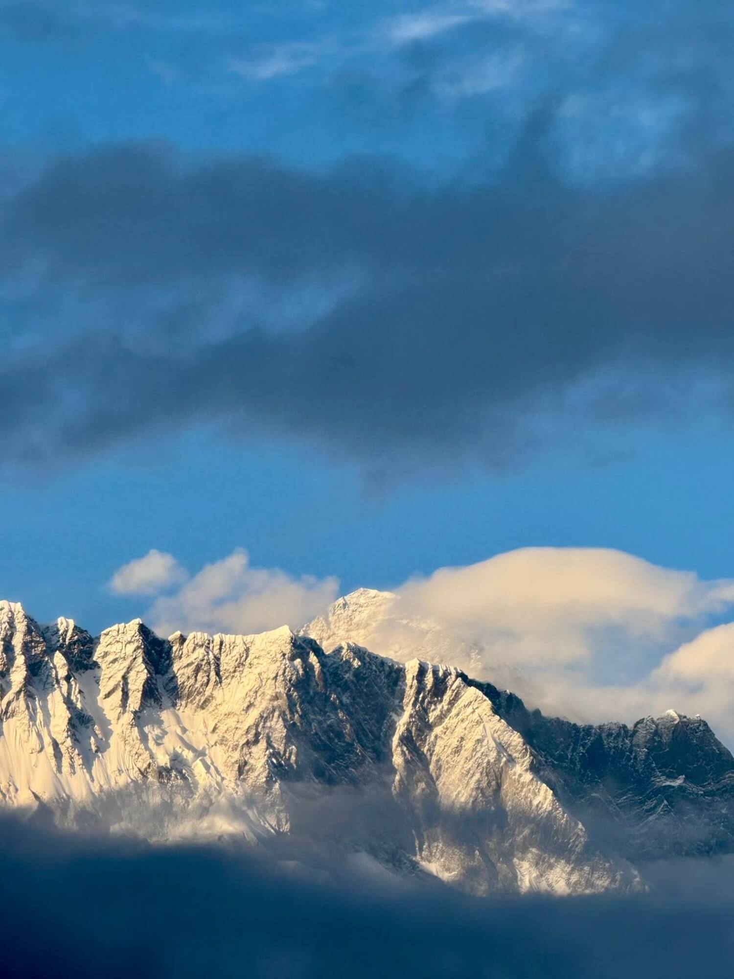 První pohledy na vrchol Everestu (úplně vzadu) z Tengboche (3850 m) na treku do základního táboru Everestu.