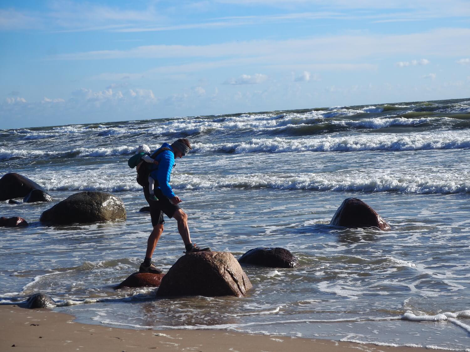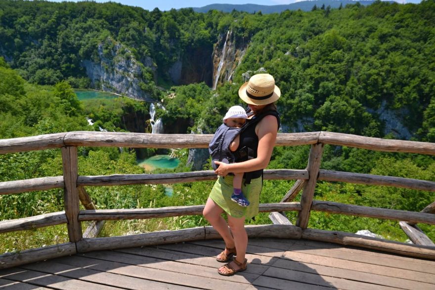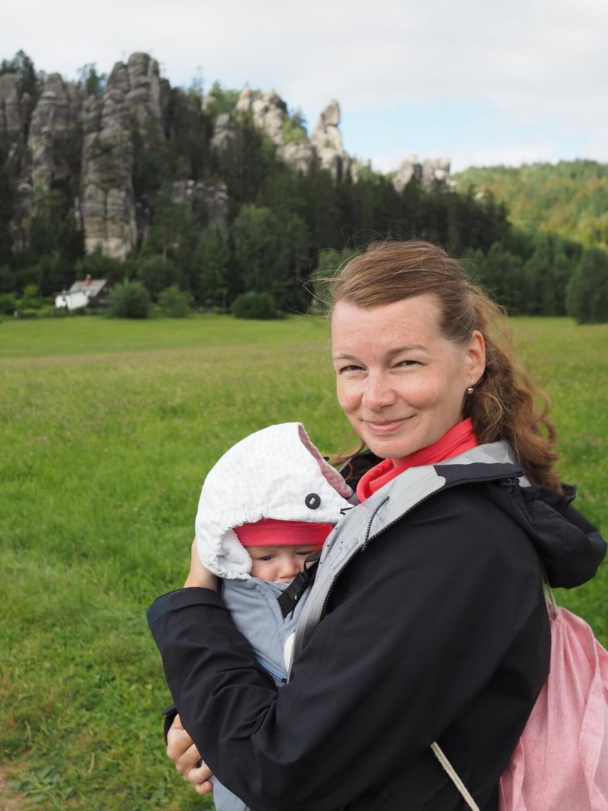 Výhodou látkového nosítka je nízká hmotnost a možnost nosit na břiše i na zádech.
