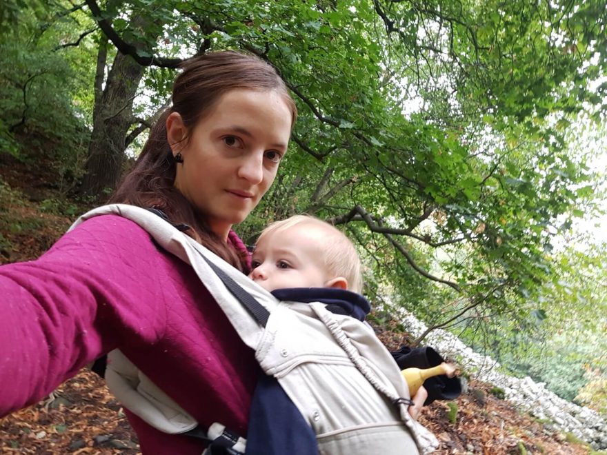 Výhodou látkového nosítka je nízká hmotnost a možnost nosit na břiše i na zádech.