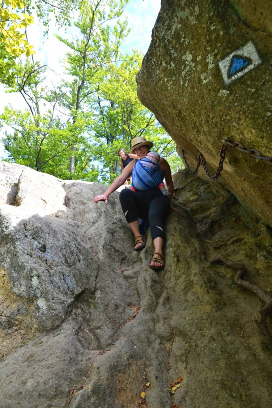 K nejjednodušším úvazům šátku patří kříž s kapsou uvnitř. Video s podrobným návodem najdete na internetu - není to tak složité, jak to na první pohled vypadá. Křížení na zádech pomáhá rozkládat váhu. Krásy Solné komory s tříměsíčním prckem v šátku.