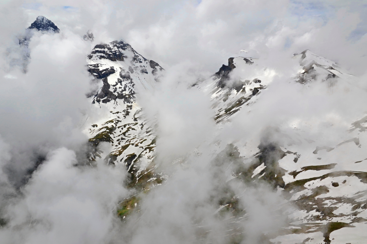 Mračna halí až třítisícové vrcholky a vytváří až surrealistickou podívanou. Schlithorn, Švýcarsko.