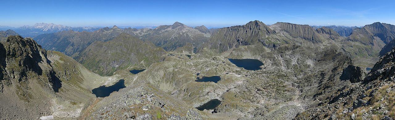 Výhled do kotle Klafferkessel z vrcholu Greifenberg, Schladmingské Taury, rakouské Alpy