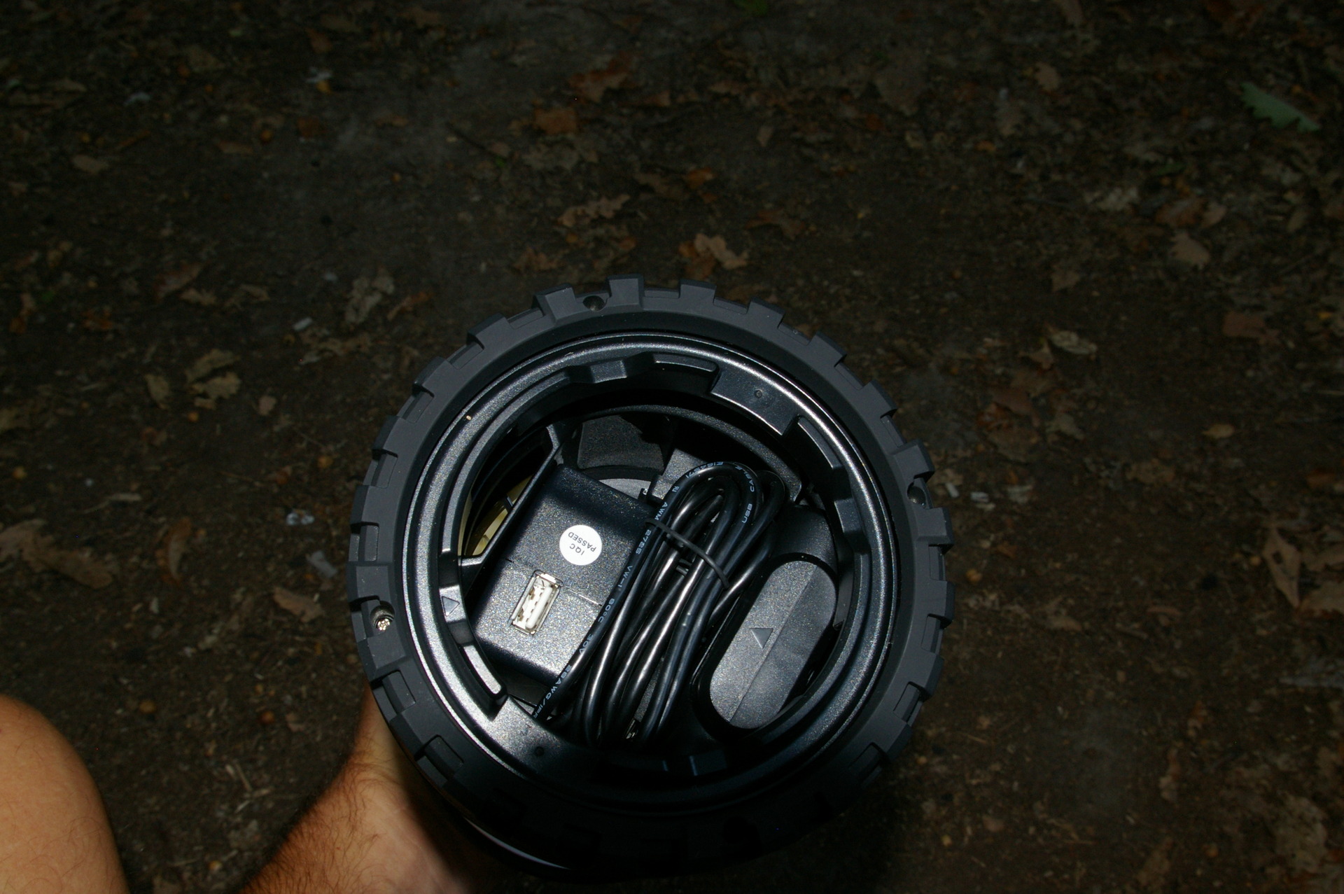 Podstavec skrývá síťovou nabíječku a USB kabel.