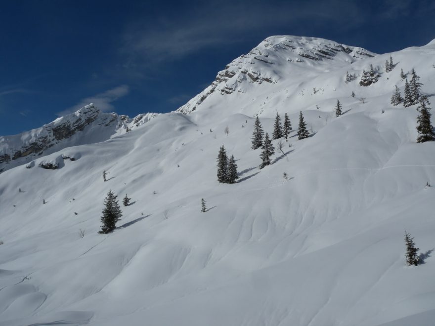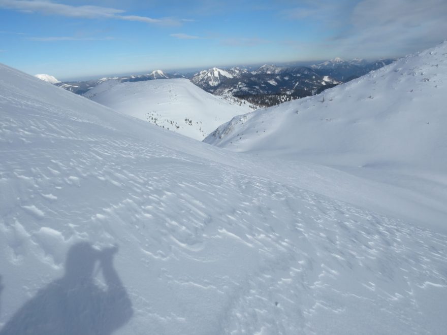 Výstup na vrchol Hochstadl na skialpech. Pohled na Tannstein.