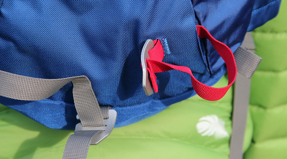 Batoh má ve svém čele dole šedý a červený popruh s hliníkovými přezkami.