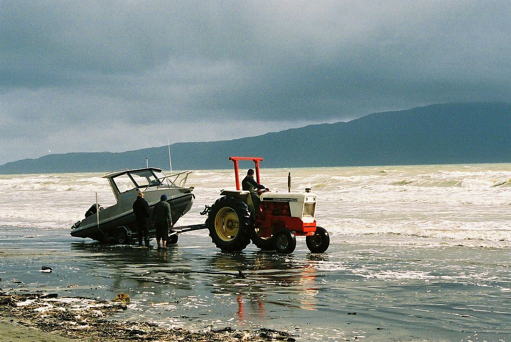 Silueta Kapiti Island mizí v blížící se bouřce stejně rychle, jako my jsme s úlevou opustili tento člun a (na fotce nenápadné) v