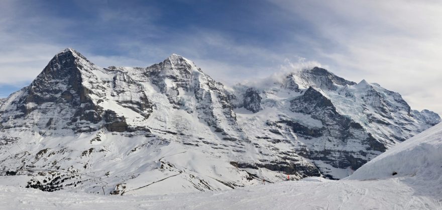 Výhledy z okna, vytesaného ve skále v severní stěně Eigeru, Švýcarsko.