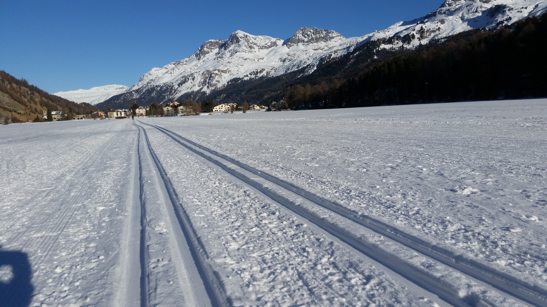 Perfektně připravená stopa, jezero Segl, Švýcarsko