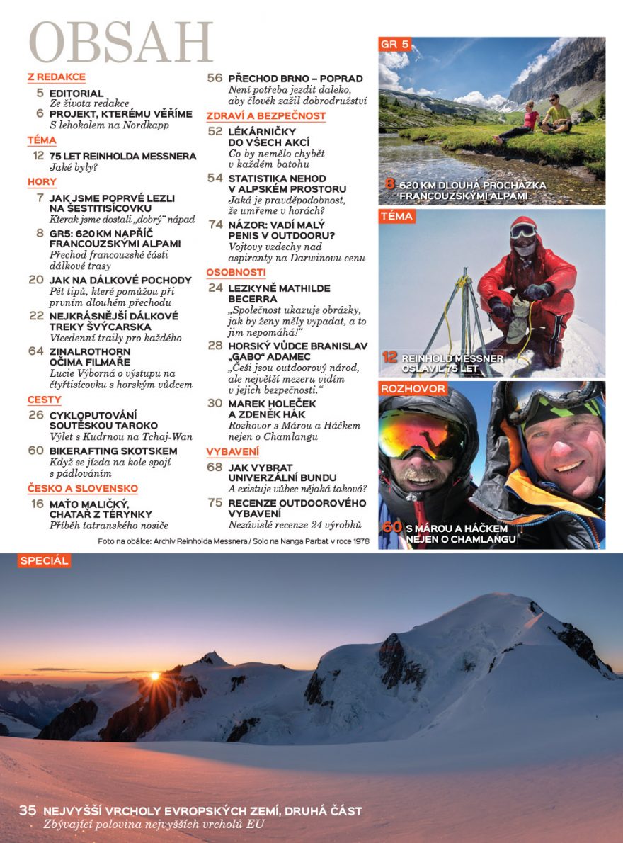 Galerie: Svět outdooru 3/2019: Reinhold Messner, po GR5 francouzskými Alpami, Mára a Háček nejen o Chamlangu, Lucie Výborná na Zinalrothornu a existuje univerzální bunda?