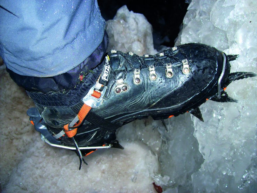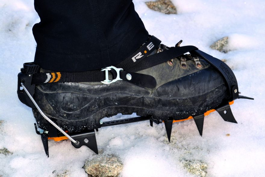 Lezecká mačka s kovovými třmeny, upnutá na skialpové botě.