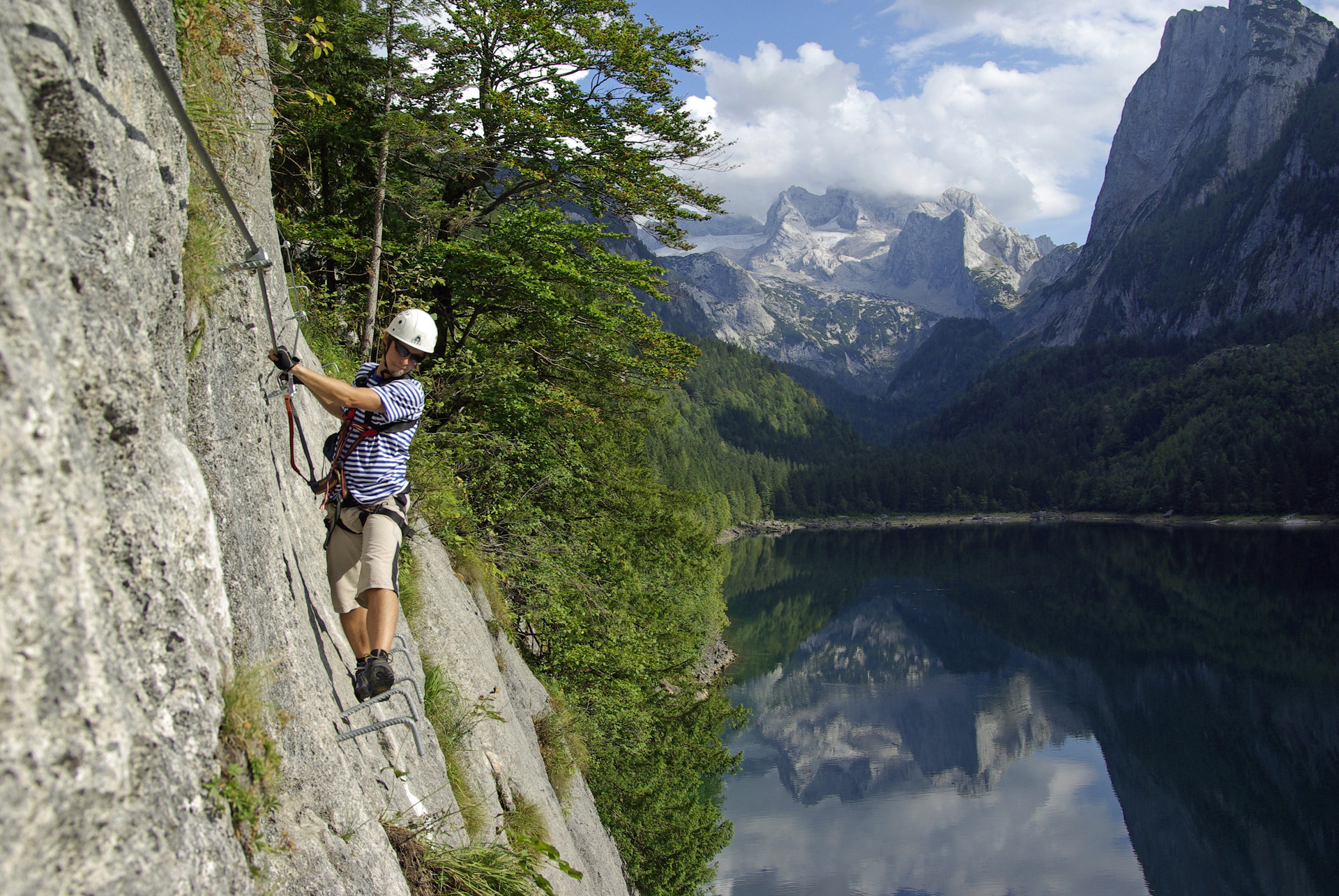Hravá ferata Laserer Alpin nad jezerem Gosausee s výhledy na masiv Dachsteinu, Solná komora