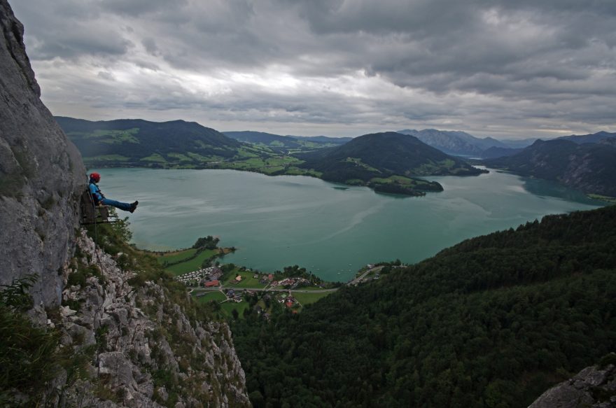 Výhledy na ledovcem pokrytý masiv Dachsteinu z feraty nad jezerem Gosausee.