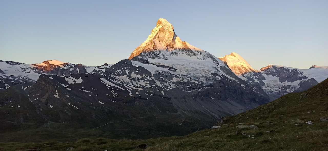Výhled na Matterhorn. Přechod z nejnižšího bodu od břehu jezera Maggiore až na nejvyšší horu Švýcarska Dufourspitze.