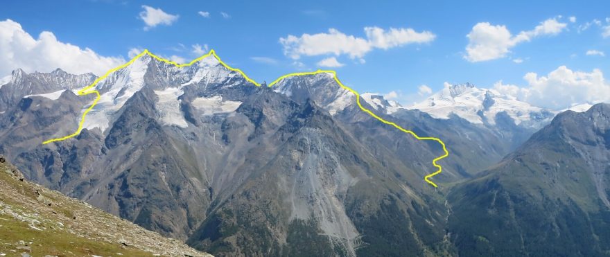 Exponované pasáže. Traverz tří Walliských klenotů – Alphubel–Täschhorn–Dom, Švýcarsko, Alpy