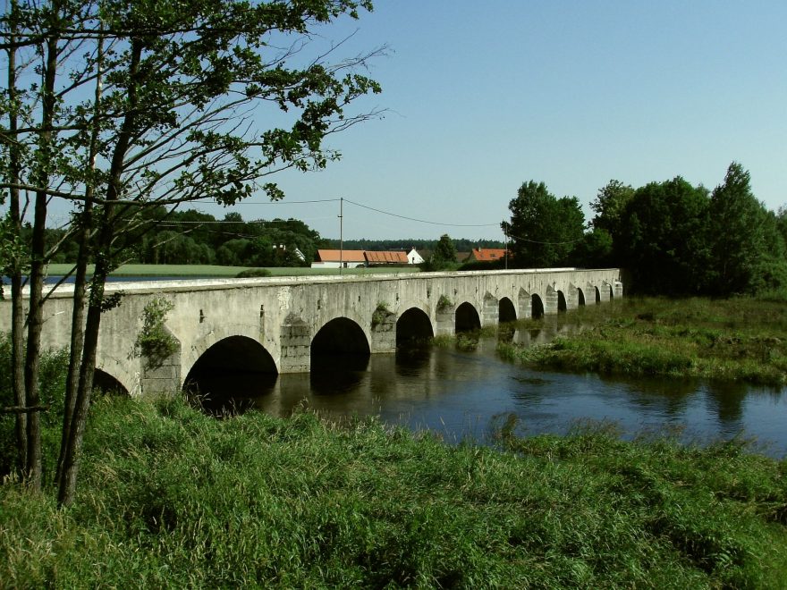 Jižní Čechy, Třeboňsko, brození na hrázi rybníku Rožmberk