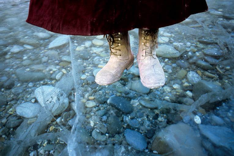 Jen občas kloužeme po ledu průsvitném jako sklo, jinde musíme koryto obcházet. Chadar trek, Indie