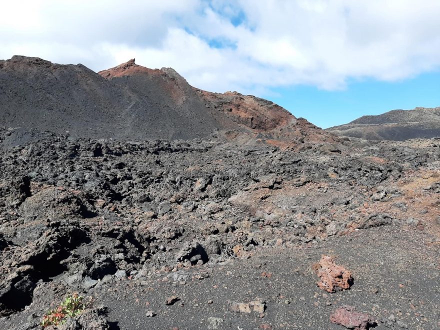 Sopka Tenequía a zřetelný proud zkamenělé lávy. Ruta de los Volcanes, La Palma, Kanárské ostrovy