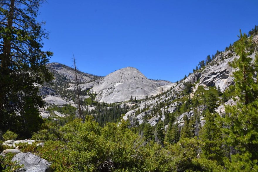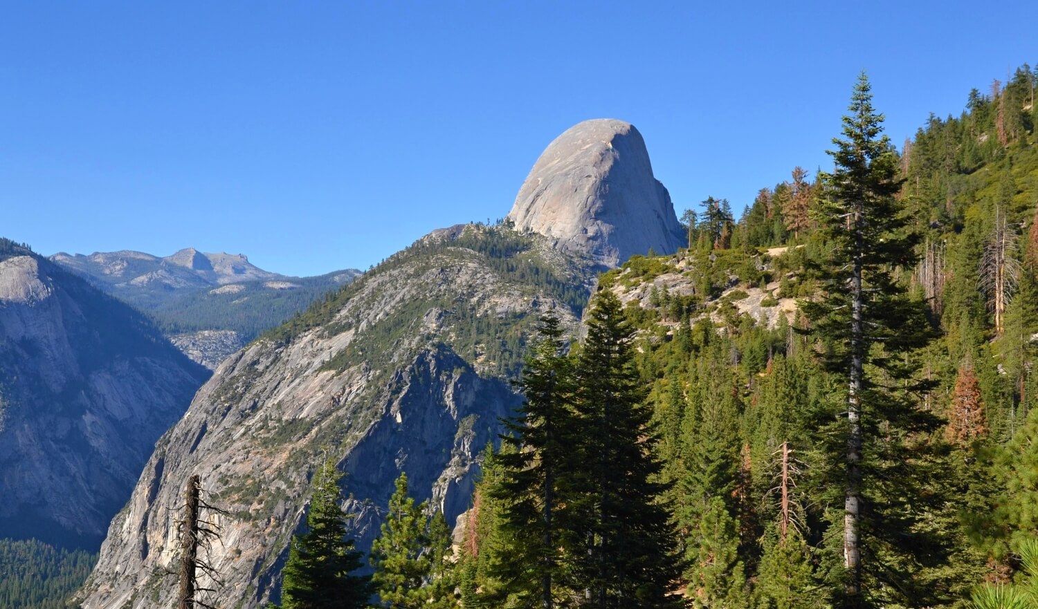 Boční výhled na Half Dome z trasy Panorama Trail. Yosemite Valley, Kalifornie, USA
