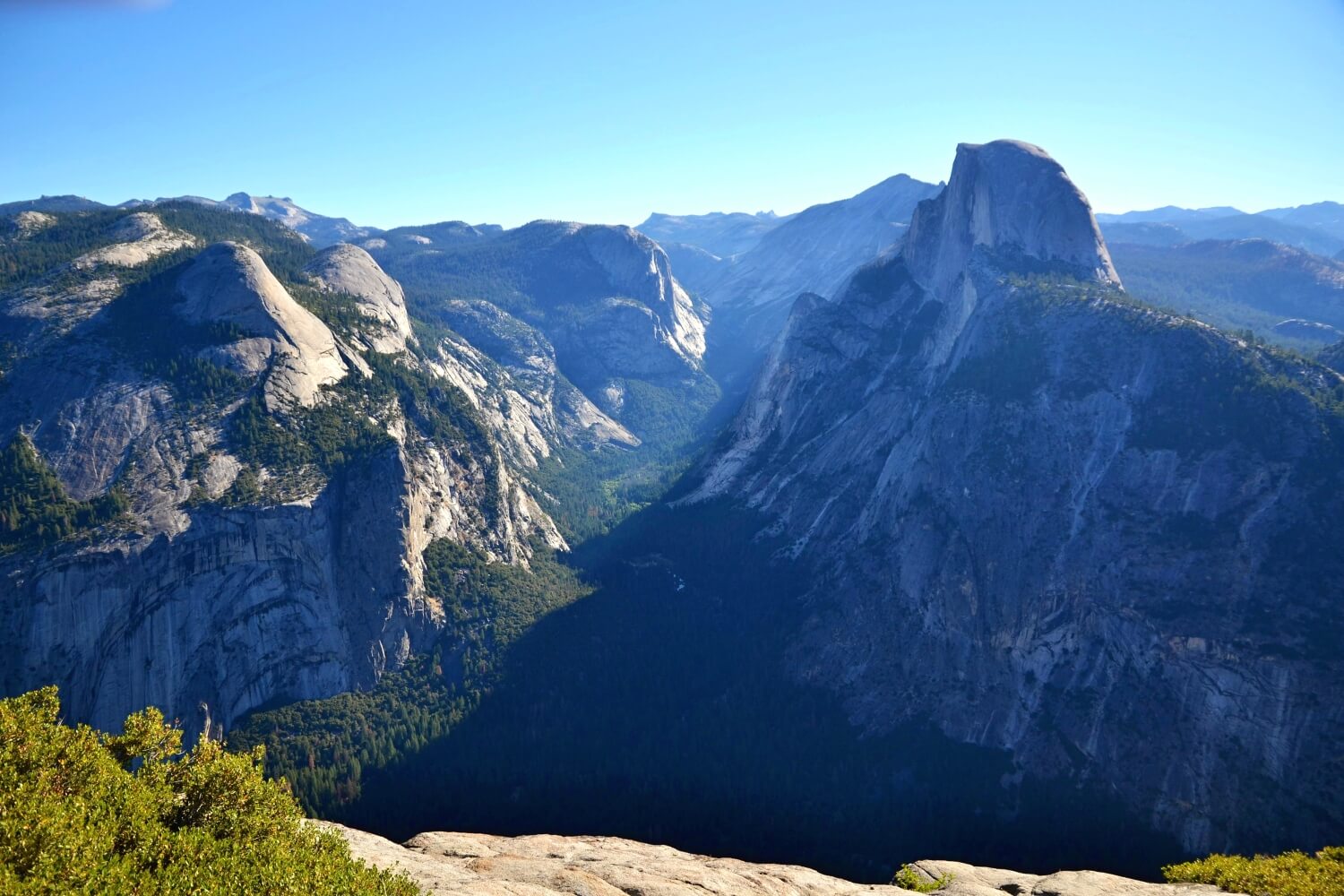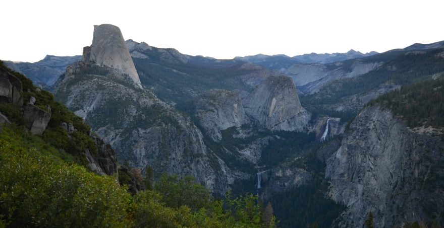 Pohled na Yosemite Valley a Half Dome z vyhlídky Glacier Point. Kalifornie, USA