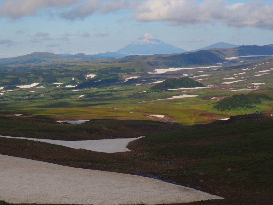 Působivá vulkanická krajina okolo sopky Ploskij Tolbačik (3682 m). Všude čpí síra a překračuje se lávová suť.