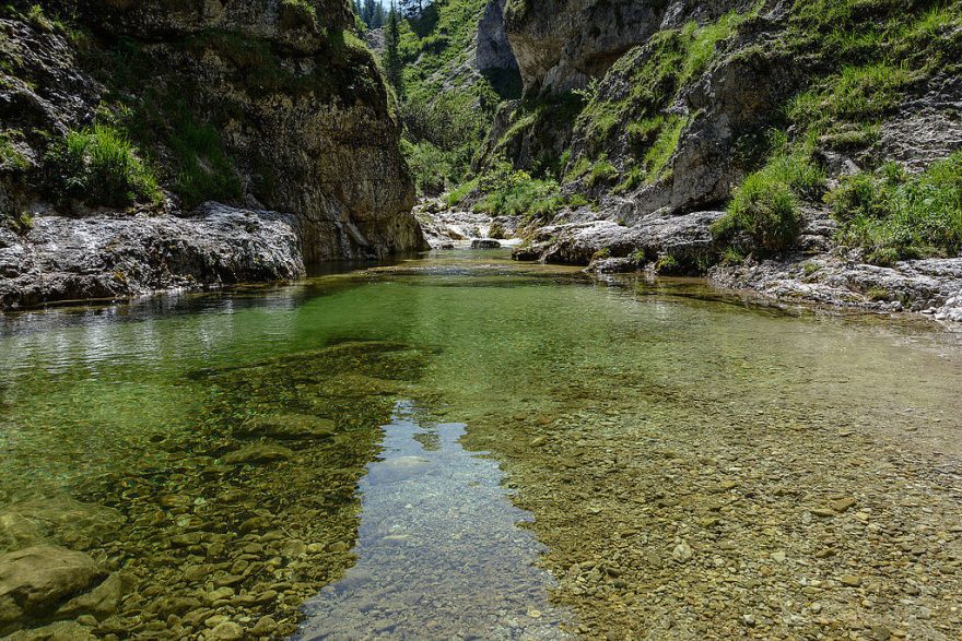 Potok Ötscherbach vytváří romantické tůně. Ötschergräben, rakouské Alpy