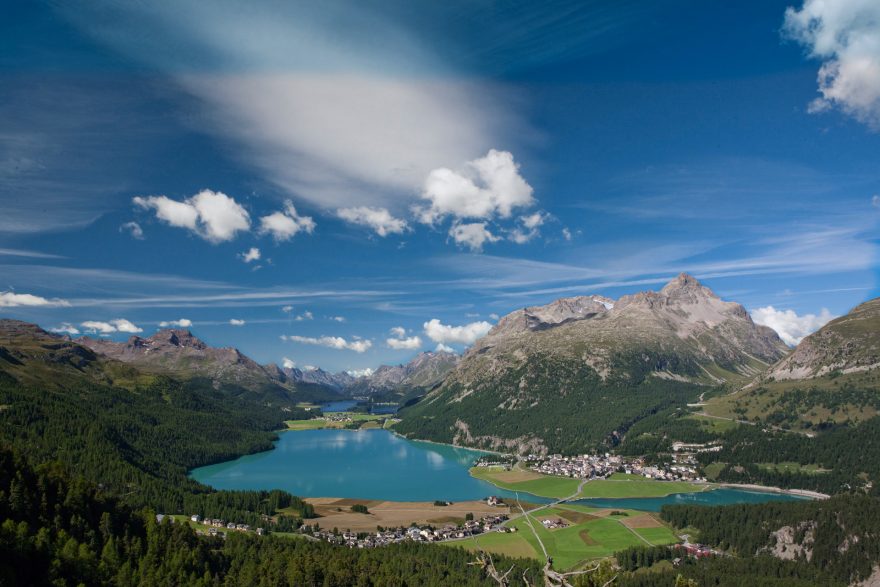 Jezero Silvaplana a vlevo hora Piz Corvatsch