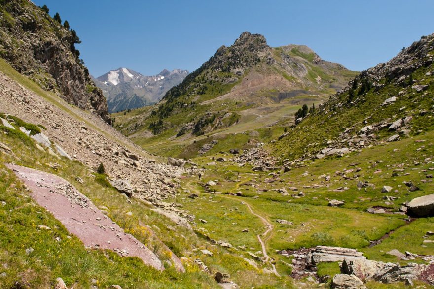 Sestup od jezer Ibónes de Anayet do vesnice Sallent de Gállego. GR 11, Pyreneje, Španělsko.