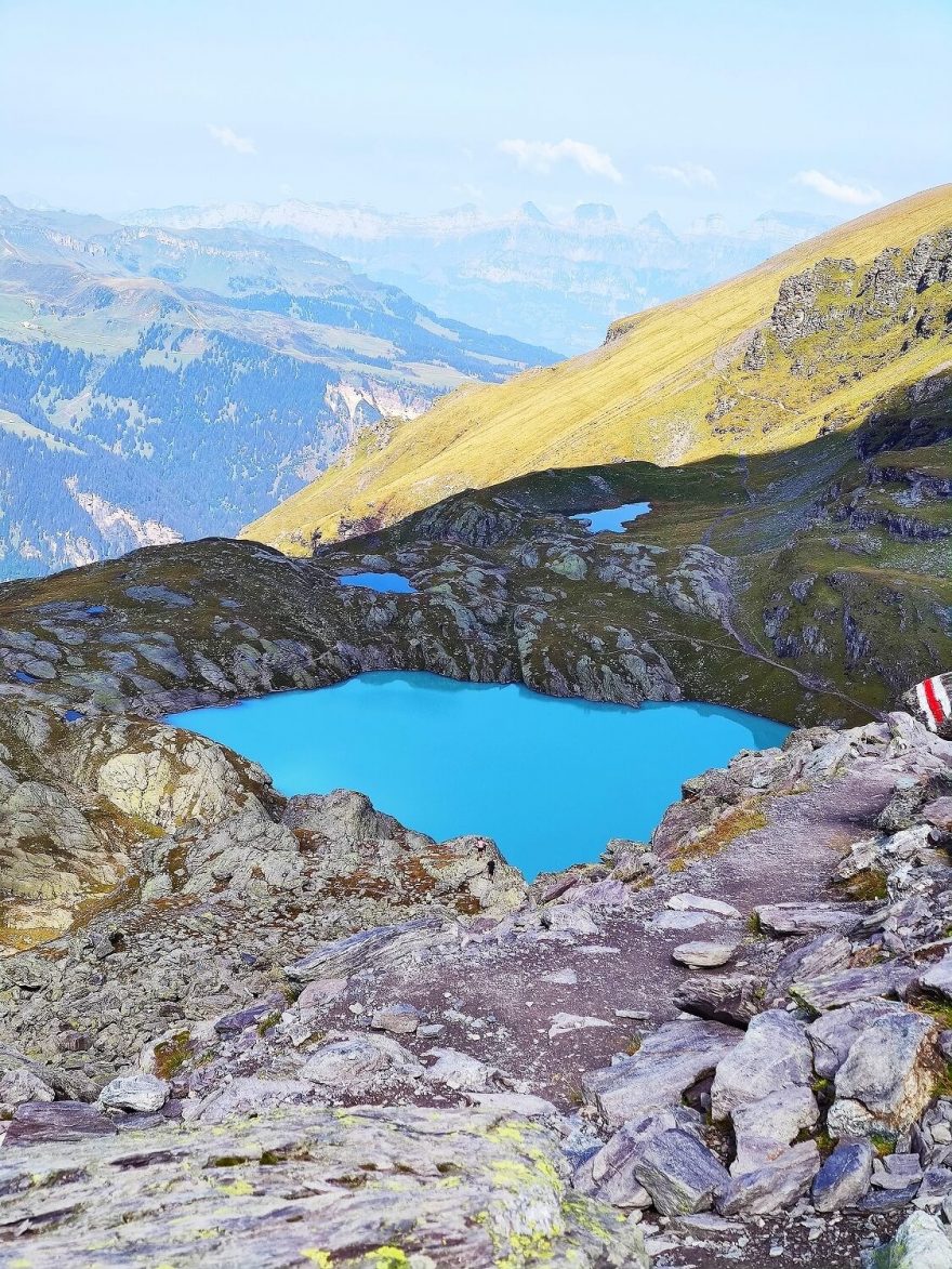 Neuvěřitelná barva jezera Schottensee. Okruh kolem 5 jezer, Pizol, 5-Seen-Wanderung, švýcarské Alpy