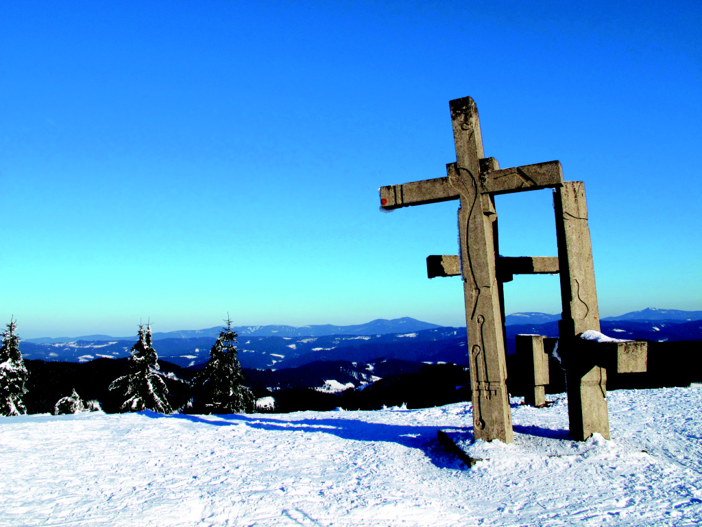 Vrcholový kříž na Stratenci (1055 m), Javorníky.