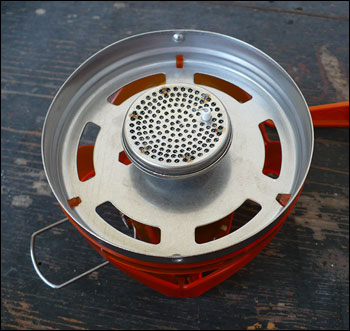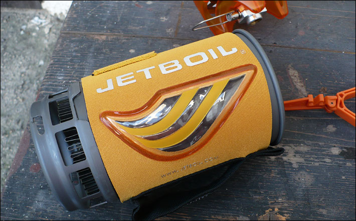 Jetboil Flash připravený k provozu, vpravo víčko-šálek který ve sbaleném stavu kryje dno nádoby.