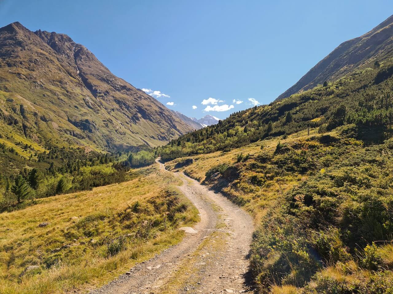 Trek Venter Runde v Ötztalských Alpách začíná příkrým stoupáním travnatou strání s pasoucími se ovcemi. Cesta stoupá mírně směrem k horám nad říčkou Niedertalbach.