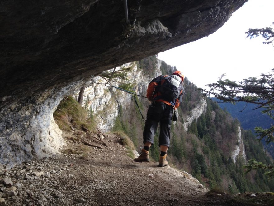 Cesta vede po skalní římse, Via ferrata du Tichodrome