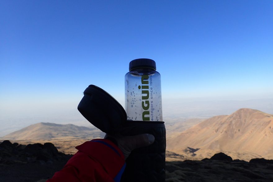 Testování lahve Pinguin Tritan Fat Bottle pod vrcholem Sabalanu 4811 m v Iránu.
