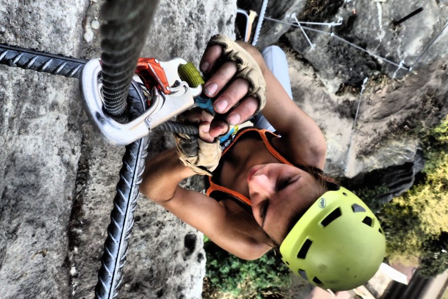 Převislé části feraty v Bechyni hodně prověří sílu rukou a vaši techniku, proto je vhodná především pro zkušené lezce.