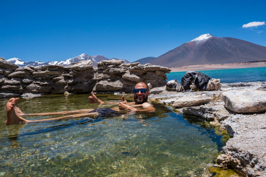 Výstup na nejvyšší aktivní sopku na světě – Ojos del Salado, vrchol Ojos del Salado, foceno z kráteru, na vrcholu stojí jeden ze členů