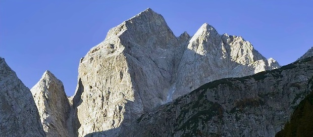 Impozantní stěna Mangartu z vrcholu Jalovec, Julské Alpy.