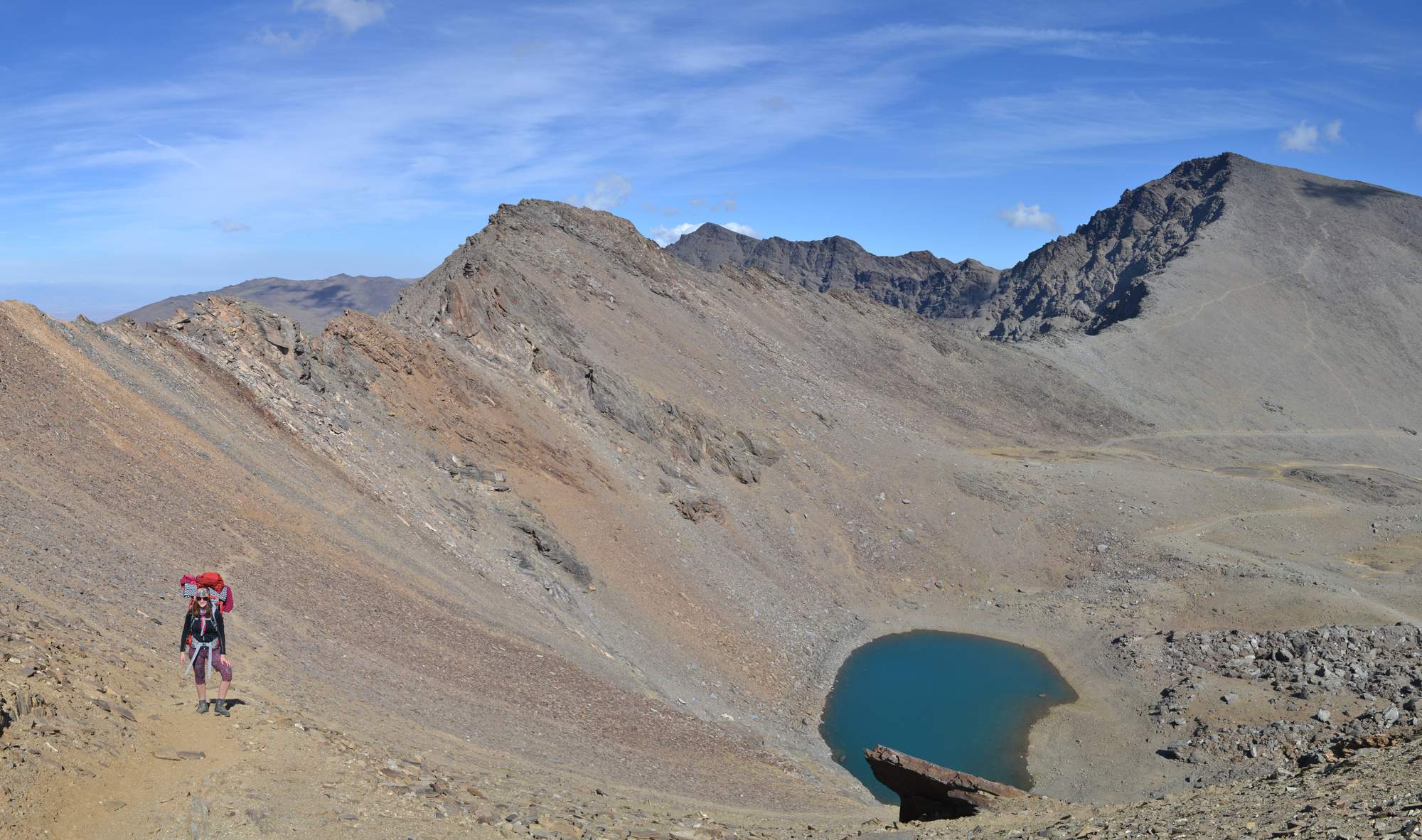 Sestup k jezeru Caldera, v pozadí Mulhacen, Sierra Nevada, Andalusie, Španělsko