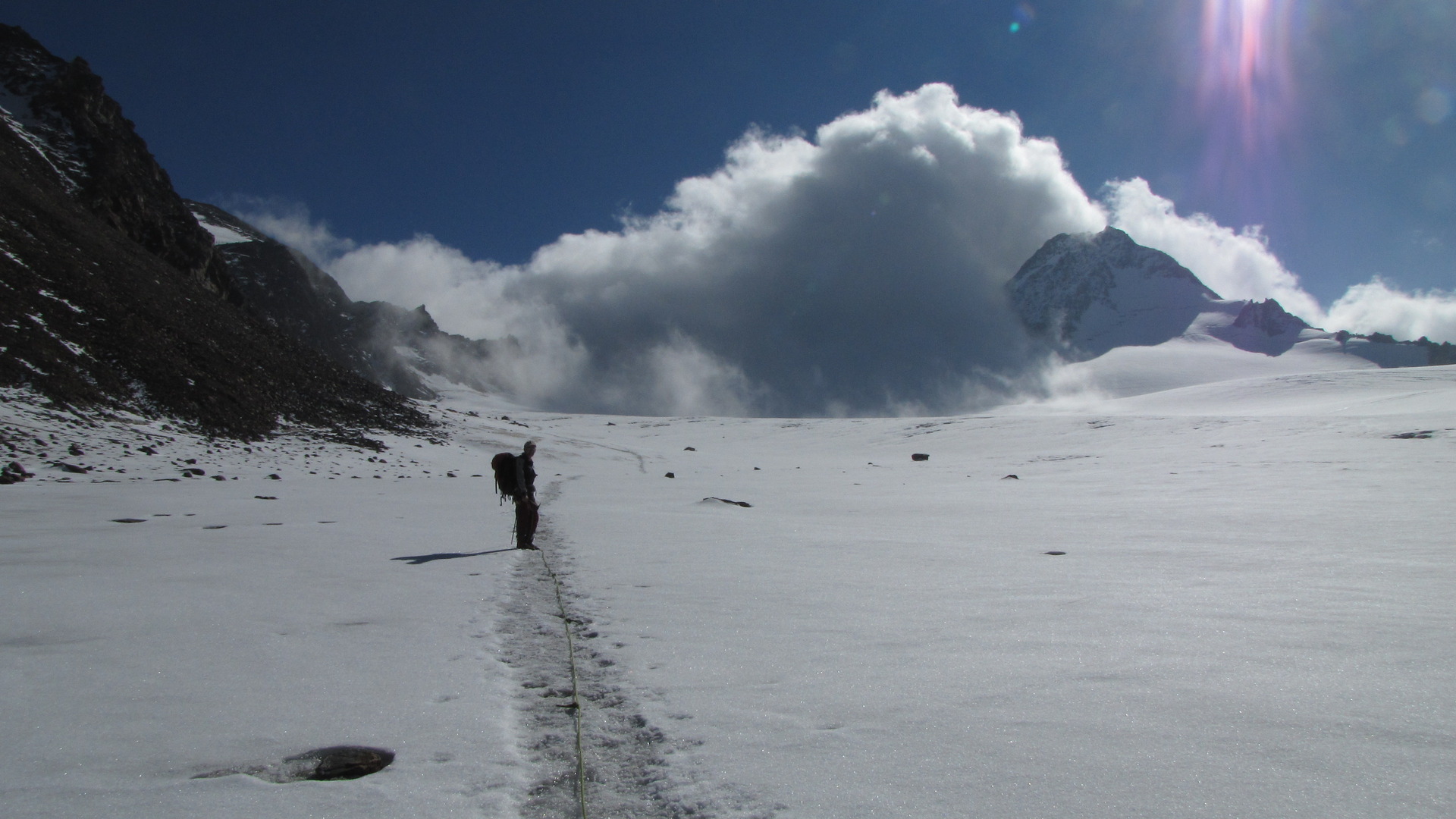 9_Ledovec Hochjochferner, pohled zpět do sedla Hauslabjoch zakrytého mraky