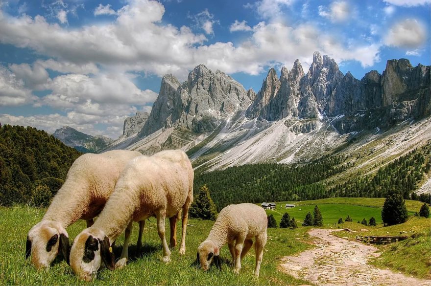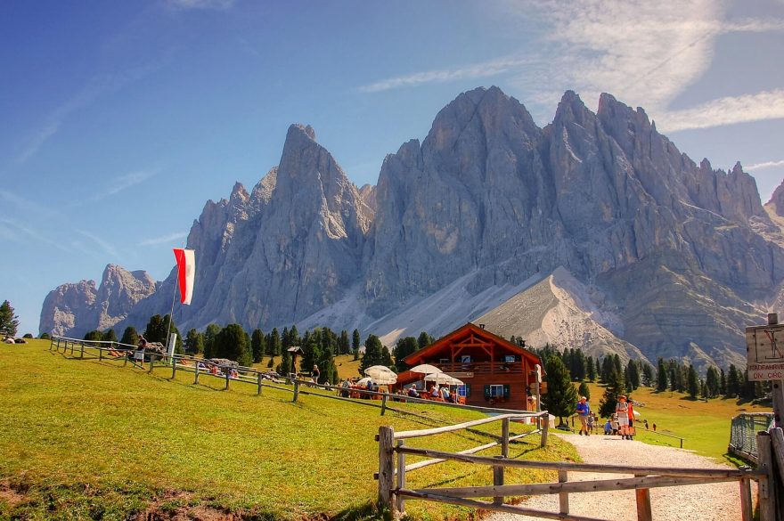 Údolí Val di Funes se zubatým hřebenem Odle (Geisler) je ikonickým pohledem Dolomit.