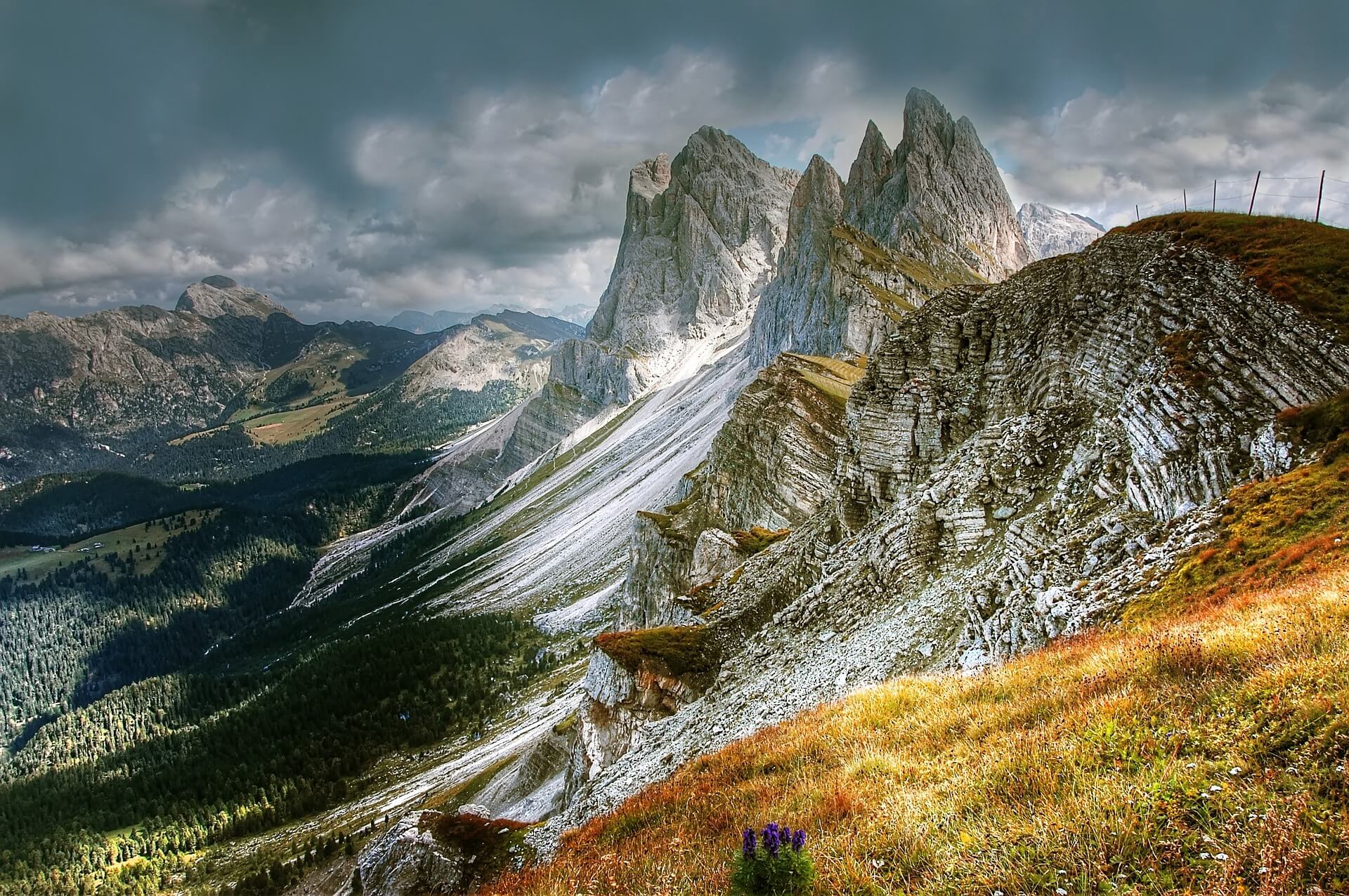 Údolí Val di Funes se zubatým hřebenem Odle (Geisler) je ikonickým pohledem Dolomit.