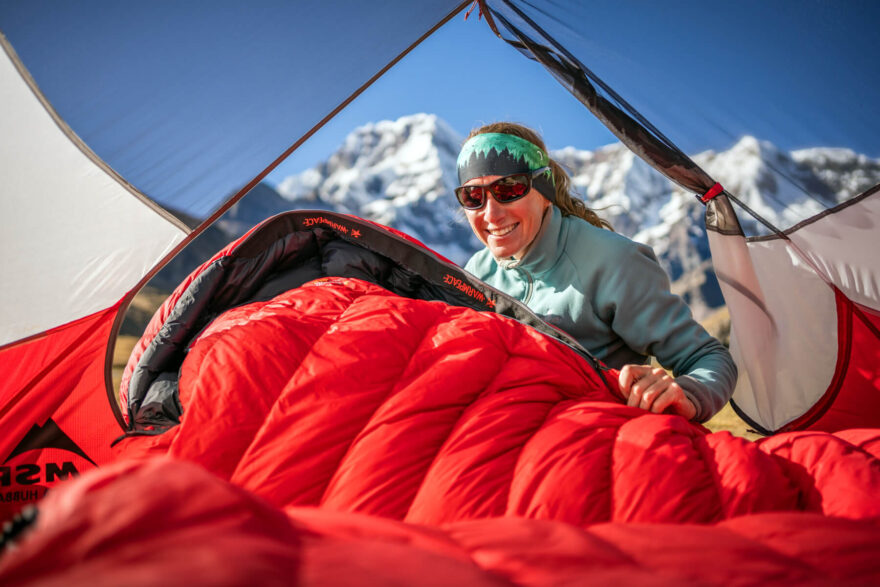 Peří jako náplň spacáků vyniká nejen nízkou hmotností a kompaktními rozměry po sbalení, ale také jako přírodní absorbér vlhkosti. Spacák Warmpeace v akci.